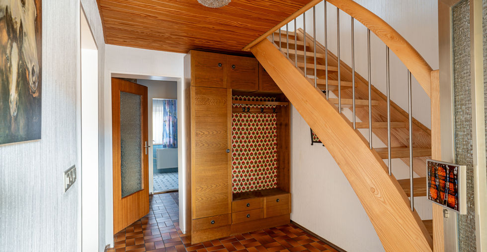 Im Obergeschoss befinden sich Zimmer mit Mansardendach, die durch ihre Raumaufteilung eine besondere Wohnatmosphäre schaffen. Das Badezimmer entspricht dem Baujahr.